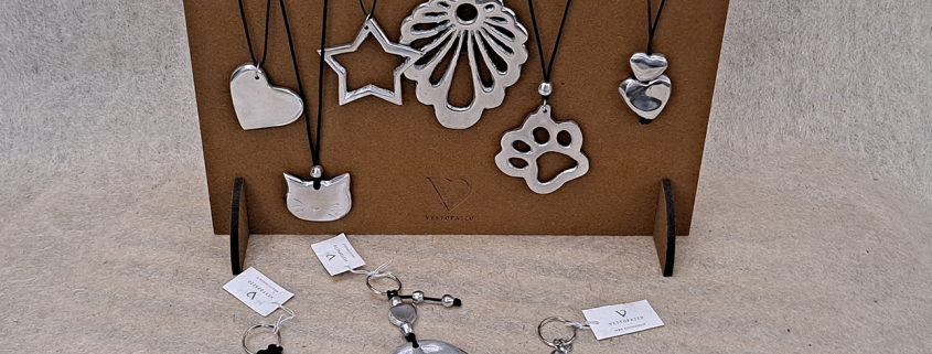 Le collane sono realizzate con un filo di corda e con il pendente in alluminio, leggero e anti-ossidante. Da portare su maxi maglie: il colore neutro permette un facile abbinamento. I portachiavi sono anch’essi in alluminio e costano dai € 12.00 ai € 17.00.